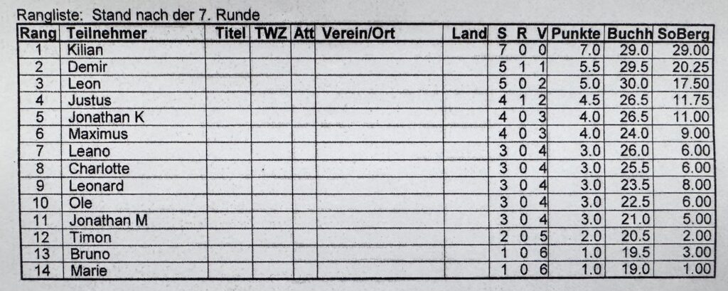 Nach gespielten sieben Runden hatte der zwölfjährige Kilian Lux seiner Gegnerschaft kein einziges Geschenk verteilt und mit sieben Siegen souverän den ersten Platz erobert. Zufrieden war auch Demir Ali Kaan, der nach seinem zweiten Platz beim Turnier „Schule und Verein“ mit 5,5 Punkten erneut auf dem Vizerang einkam. Für Aufmerksamkeit sorgte als Dritter Leon Melle, der noch kein Vereinsmitglied ist und überhaupt zum ersten Mal beim ESK-Trainingsabend vorbeischaute. Er nahm nicht nur fünf Punkte und den für alle Spieler traditionellen Schokoladen-Nikolaus mit nach Hause, sondern auch gleich noch ein Anmeldeformular für unseren Verein.