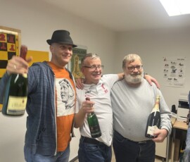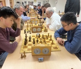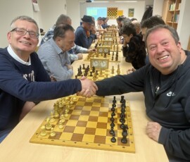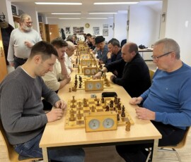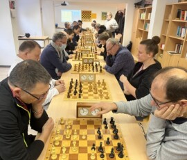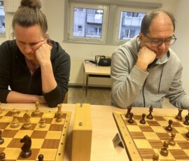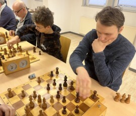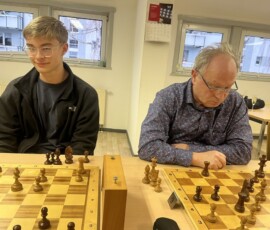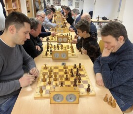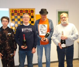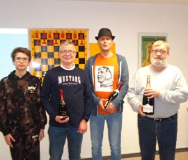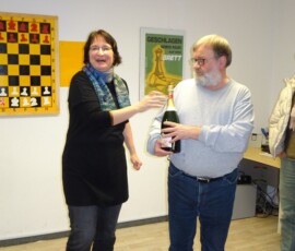 28 Teilnehmer fanden sich zum traditionellen Sektblitzrturnier des ESK zum Jahresanfang ein. Gestärkt durch viel Sekt, Bier, Frikadellen, Schweinebraten, verschiedene Salate etc. – alles vorbereitet von Doreen und Christian Troyke, an dieser Stelle nochmals herzlichen Dank dafür – ging es durch das Turnier. Nach 27 Runden und ca. fünfeinhalb Stunden Spielzeit standen die Erstplatzierten fest. Gewinner war das Team Franz Bräuer / Thomas Casper (Franz musste nach der Hälfte des Turnier wegen seines anwesenden Kleinkindes gehen) mit 23,5 Punkten vor Christian Troyke ebenfalls 23,5 Punkte, nur getrennt durch die bessere Sonneborn-Berger-Wertung. Dritter und Vierter wurden mit 23 Punkten, ebenfalls getrennt durch die Sonneborn-Berger-Wertung Matthias Schöwel und Anton Belin.