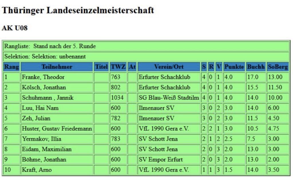 Schöner Doppelsieg für den ESK bei der Landesmeisterschaft U8 in Stadtilm: Theodor Franke gewann nach spannendem Verlauf den Titel vor seinem Vereinskollegen Jonathan Kölsch und Jannik Schuhmann von Gastgeber Blau-Weiß Stadtilm. Alle drei lagen mit jeweils vier Punkten aus fünf Runden gemeinsam vorn, so dass die Wertung entscheiden musste. Diese fiel letztlich klarer aus als erwartet.