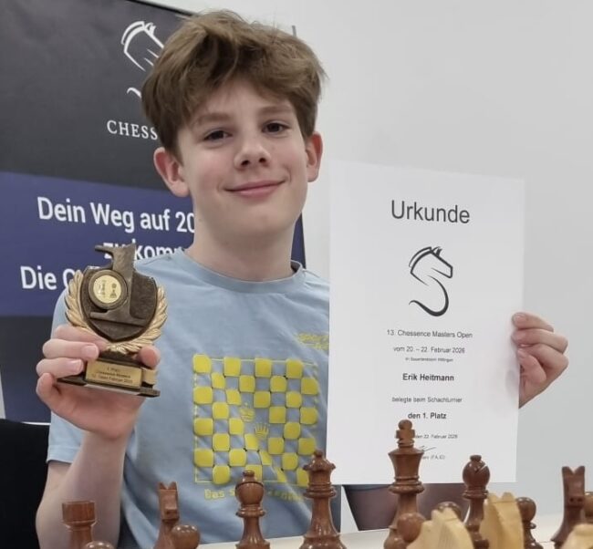 Toller Erfolg für Erik Heitmann: Der 13-Jährige hat das Chessence Masters in Willingen gewonnen. Mit vier Punkten aus fünf Runden behauptete sich Erik am Ende ungeschlagen allein auf dem Spitzenplatz – gegen durchweg passable Gegnerschaft. Der Eloschnitt des Turniers lag bei 1903. Der ESK-Youngster dürfte damit mehr als 60 Elo-Punkte hinzugewonnen haben und steuert nun bereits die 2000er-Marke an.