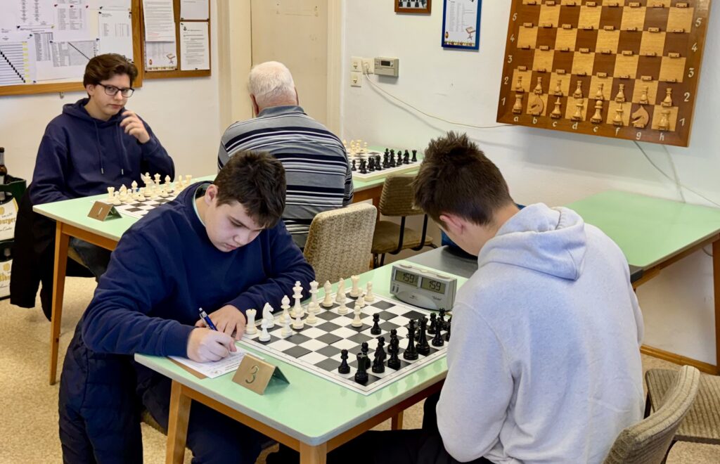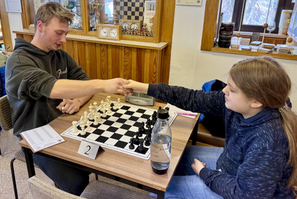 Am längsten musste Jonas Bach mit den weißen Steinen am Spitzenbrett kämpfen. Nachdem er in der Eröffnung einen Bauern eingebüßt hatte, hielt er den hartnäckigen Gewinnbemühungen des Gegners stand. Dass am Ende statt des erhofften Remis sogar ein voller Punkt im Spielbericht stand, hatte er allerdings Schachgöttin Caissa zu verdanken. Vor die Alternative gestellt, die Damen zu tauschen oder dem Angebot auszuweichen, entschied sich Jonas‘ Gegner für ein Schachgebot, mit dem er einzügig die eigene Dame einstellte. Aber Glück hat bekanntlich nur der Tüchtige. Damit waren nach rund zweieinhalb Stunden die Überraschung und die Gewissheit perfekt: auch die vierte Mannschaft kann gewinnen.