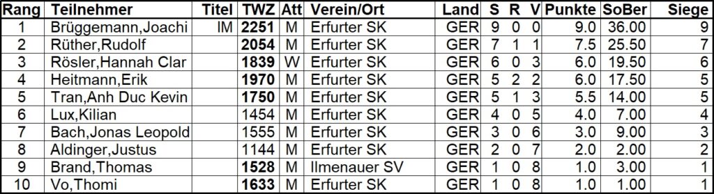 Endstand Blitzturnier 20.3.2026 GrandPrixESKHerunterladen Stand Grand Prix Wertung Beitragsnavigation ESK gewinnt die Thüringer Mannschaftblitzmeisterschaft, Stefan Wicklein wird Thüringer BlitzeinzelmeisterESK gewinnt die Thüringer Mannschaftsvereinsmeisterschaft (ThVM) in der AK U20