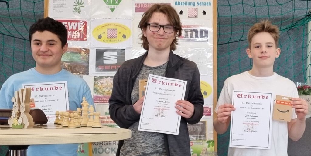 Am weitesten vorn landete als Zehnter der Gesamtwertung mit Erik Heitmann der Jüngste der vier. Der 13-Jährige überzeugte in seiner Vorrundengruppe mit 6,5 Punkten aus neun Partien. Im gut besetzten A-Finale kamen dann zwar nur 2,5 Zähler zusammen, doch die reichten immerhin noch zum dritten Jugendpreis. Ein bisschen haderte Erik mit dem Zeitmodus. Es wurde ohne Inkrement gespielt, was ihm bei der Realisierung der ein oder anderen Gewinnstellung Schwierigkeiten bereitete. Ein paar aufmunternde Worte vom Arnstadt-Erfurter Jürgen Heß (Platz sechs im B-Finale) brachten Erik wieder in die Spur.