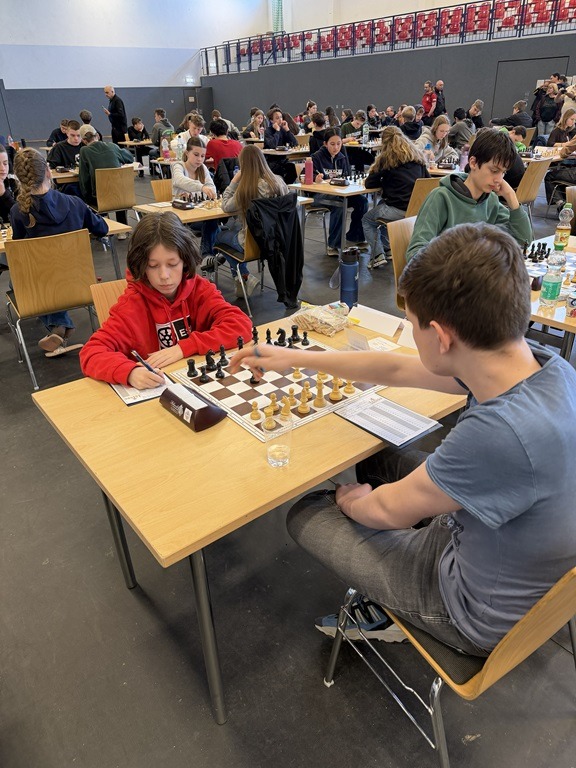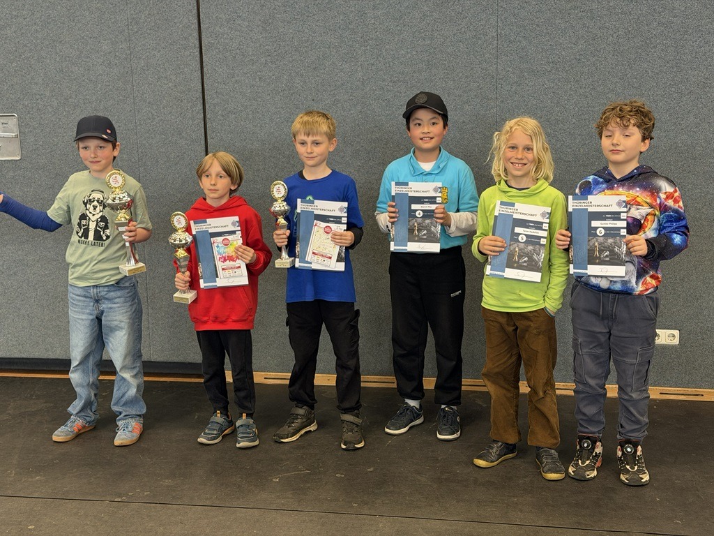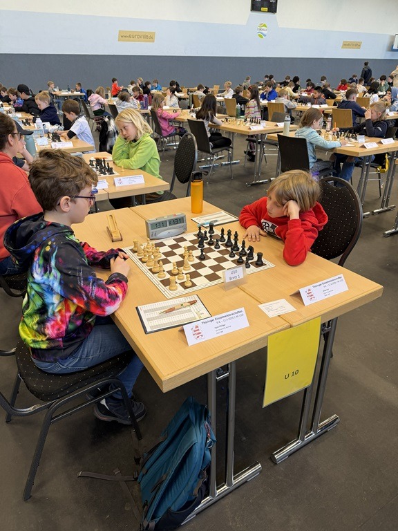 Hier machen wir einen Sprung zu unseren „Kleinen“, die aber durchaus groß aufspielten. Der achtjährige Jonas Lux schaffte es, in der Altersklasse in einem sehr ausgeglichenen Feld mit 5,5 Punkten aus 7 Partien den 2. Platz zu belegen und darf sich nun 1 Jahr lang „Vizemeister Thüringen“ nennen. Jonas erspielte sich somit einen Startplatz bei den Deutschen Meisterschaften im Juni. Auch hier: herzlichen Glückwunsch, Jonas!! Bemerkenswert ist, dass die Partien oftmals rund 3 Stunden dauerten, eine herausragende Konzenzentrationsleistung in diesem Alter! In der gleichen Altersgruppe startete ebenfalls Jonathan Kölsch (gerade mal 7 Lenze…), der sich 4 Punkte erkämpfte und den 9. Platz bei 24 Teilnehmern belegen konnte. Jonathan und Jonas trainierten oftmals auch abends noch leidenschaftlich miteinander, der Spaß am Schach war beiden anzumerken.